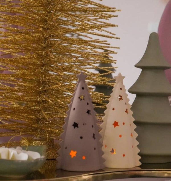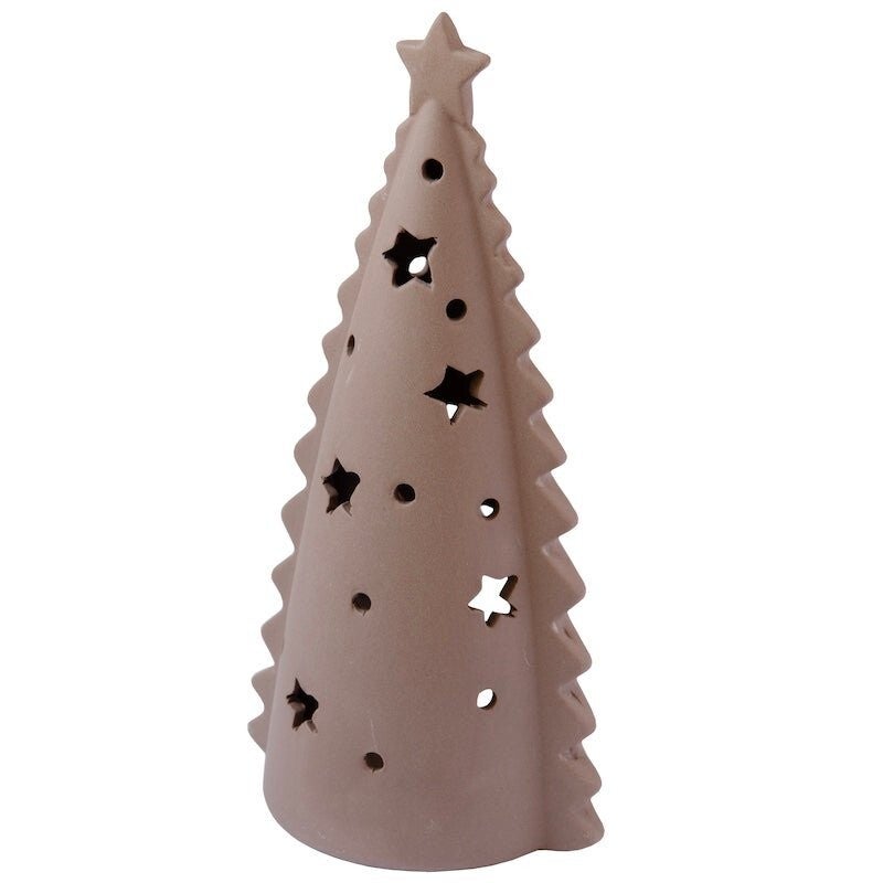 Haal de kerst sfeer in huis met deze kerstboom gemaakt van keramiek. Zet een waxinelichtje onderin en het licht schijnt gezellig door de sterren.