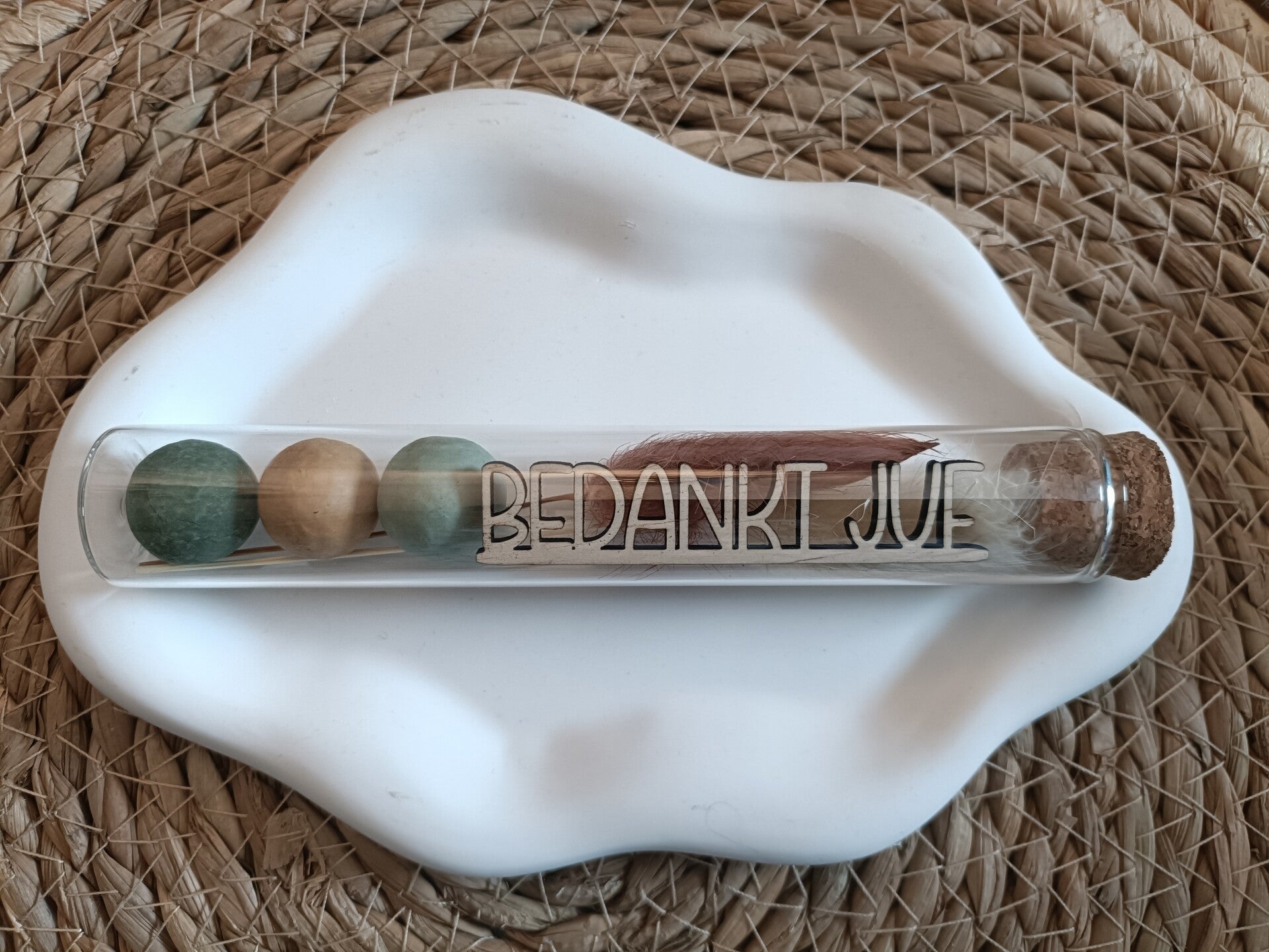 Glazen buisje gevuld met droogbloemetjes, 3 blossombs en houten tekst Bedankt Juf of Bedankt Meester.