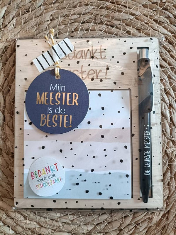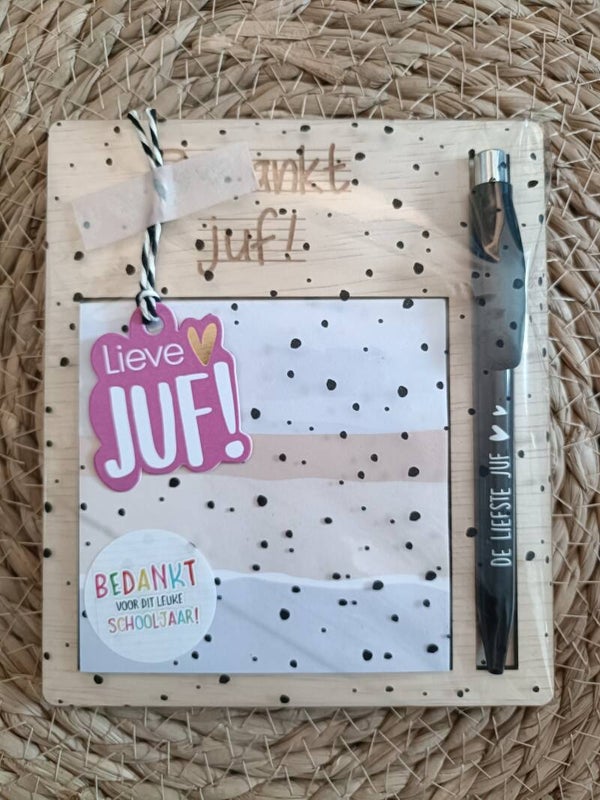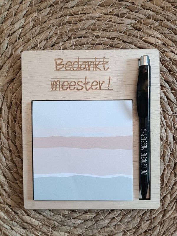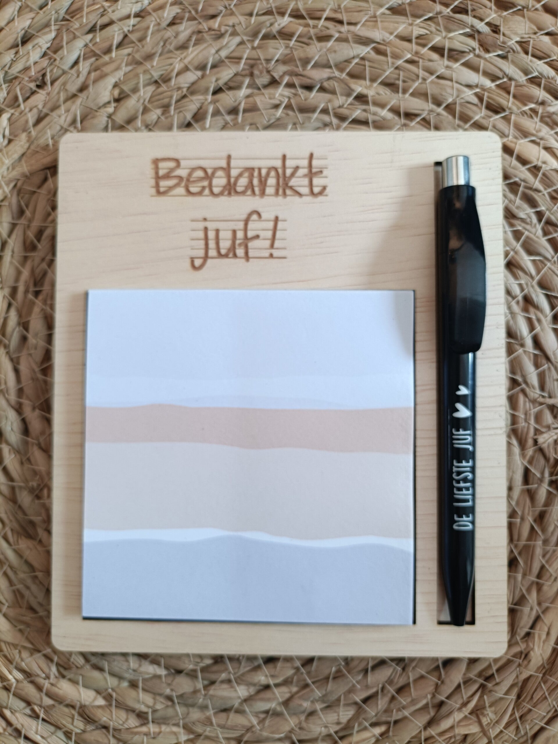 Houten notitieblokhouder incl. notitieblok en pen met opdruk.